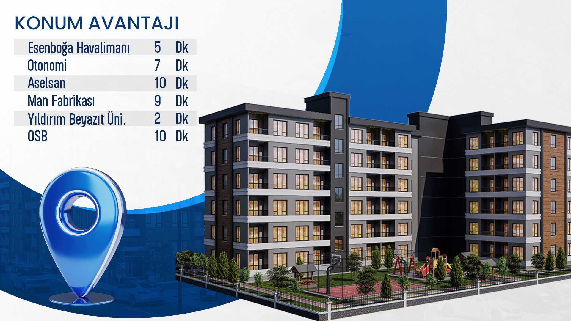 Esenboğa Havalimanı: 5 Dk | Yıldırım Beyazıt Üni: 2 Dk | Otonomi: 7 Dk | Aselsan: 10 Dk | MAN: 9 Dk | OSB: 10 Dk.